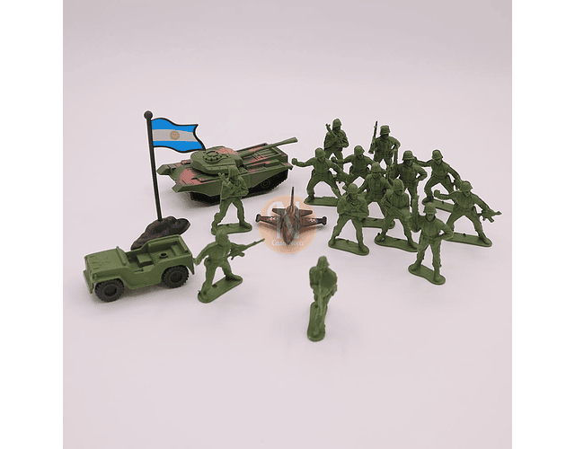 Incluye 14 soldados, 1 avión, 1 tanque, 1 jeep y 1 bandera